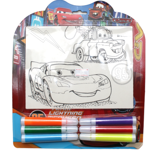 - المحتوى: كرت سبورة مع رسم سيارة + 6 ألوان مائية ملونة.